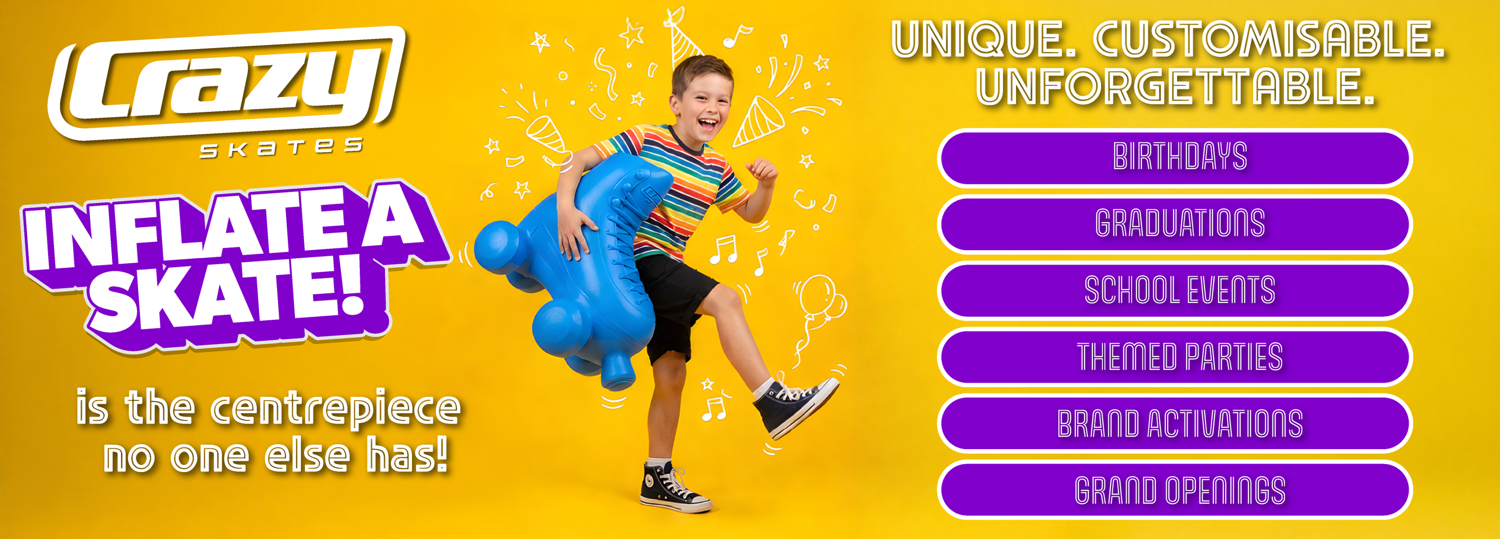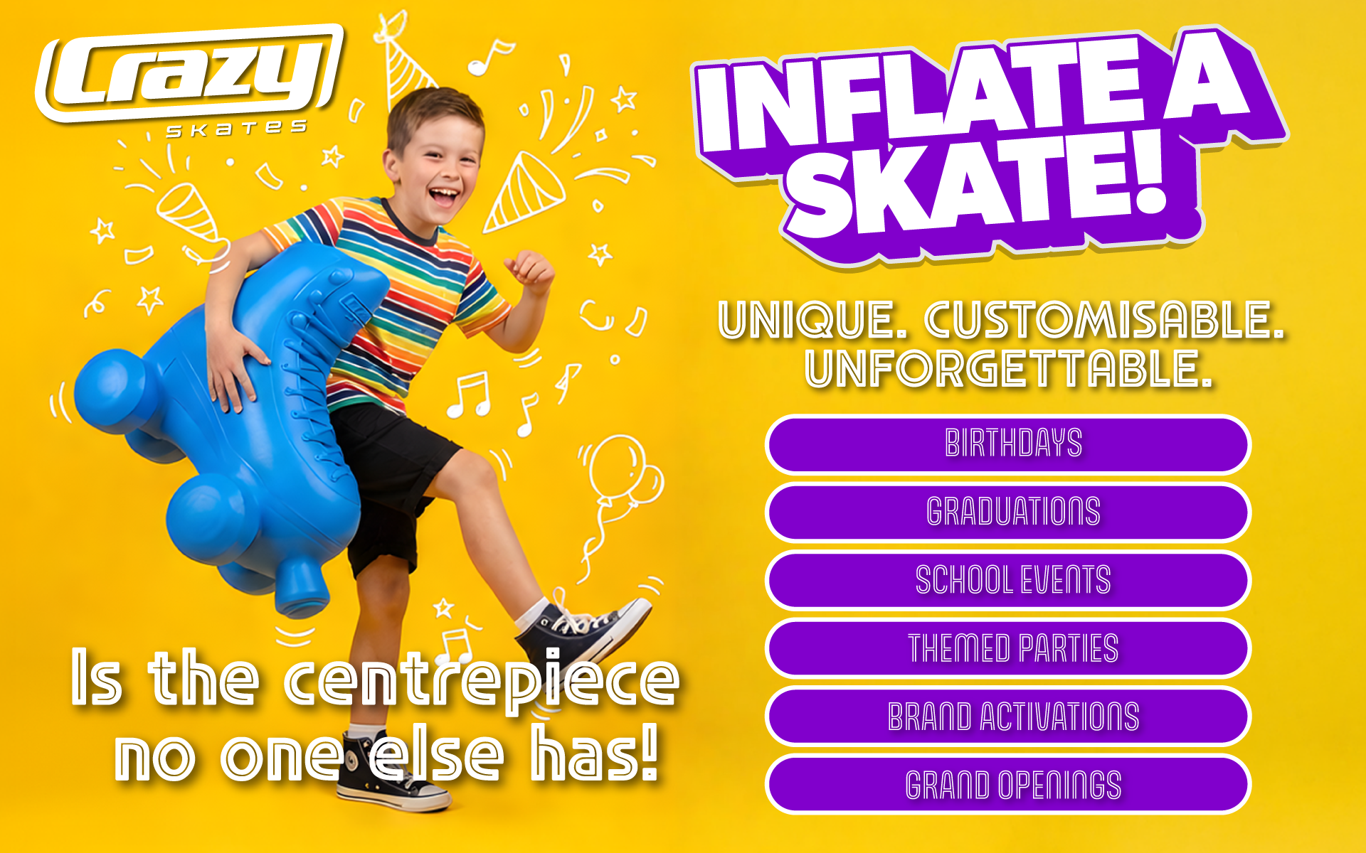 Turn every party into an unforgettable celebration with Inflate-A-Skate. A fun, interactive centrepiece that makes your event truly memorable