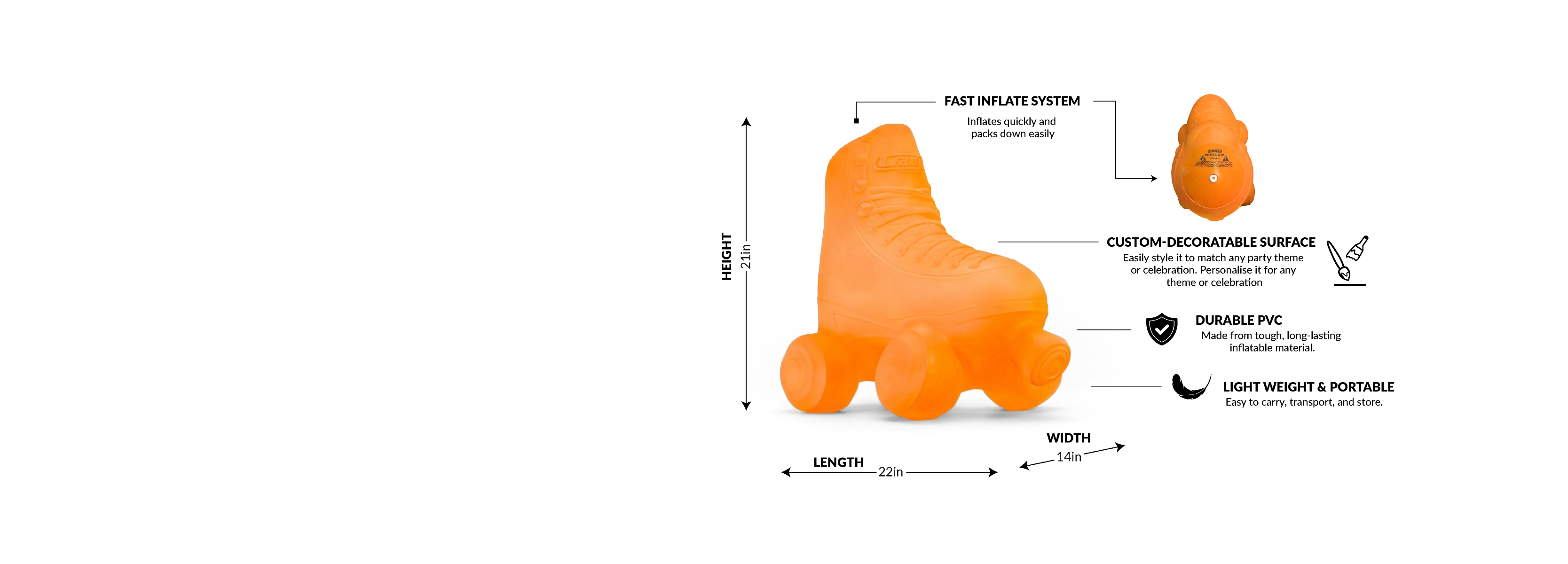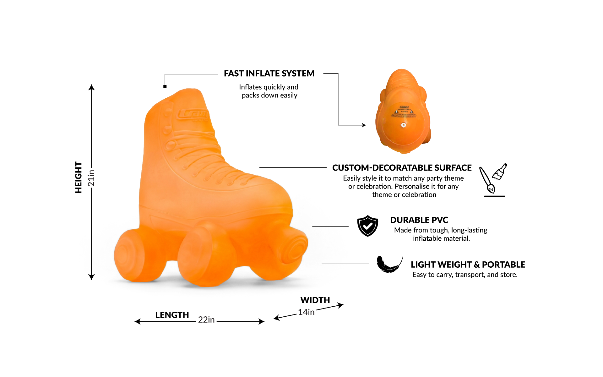 This is not Balloon - it is so much more!!! The INFLATE-A-SKATE is a durable PVC inflatable roller skate that is designed to be a long lasting decorative memento. The INFLATE-A-SKATE was designed as a blank canvas so it can be used for a wide variety of events, promotions, retail and event decorations as well as the perfect signing memento for special occasions like birthday parties, graduations and special events!